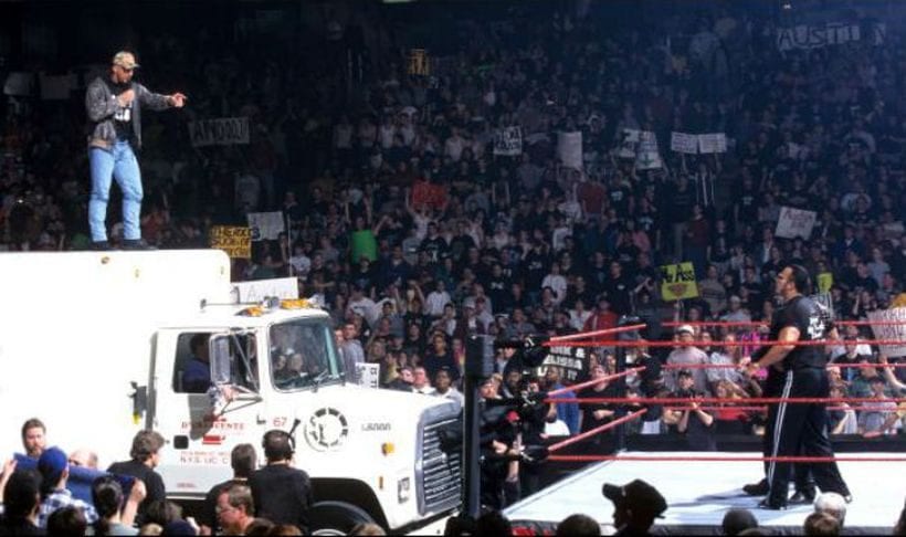 Yes, we have Steve again, and this time it is all about his beer truck. Why is this one special? Well, if you recall, it got famous after his feud with The Rock, but what really skyrocketed its popularity is the time when Steve brought it to the match and literally soaked people in the ring with the beer from the truck. Afterwards, he took a beer bath in it, while the fight was still going on.